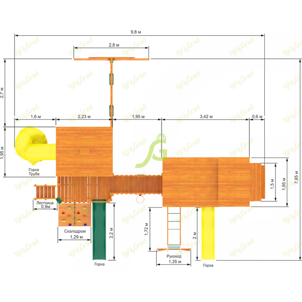 Детская площадка “IgraGrad Великан 2 (Макси) мод.1” включает: – конструкция двухуровневого зашитого снизу домика из клееного бруса 100х100 мм; –