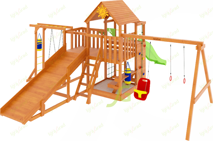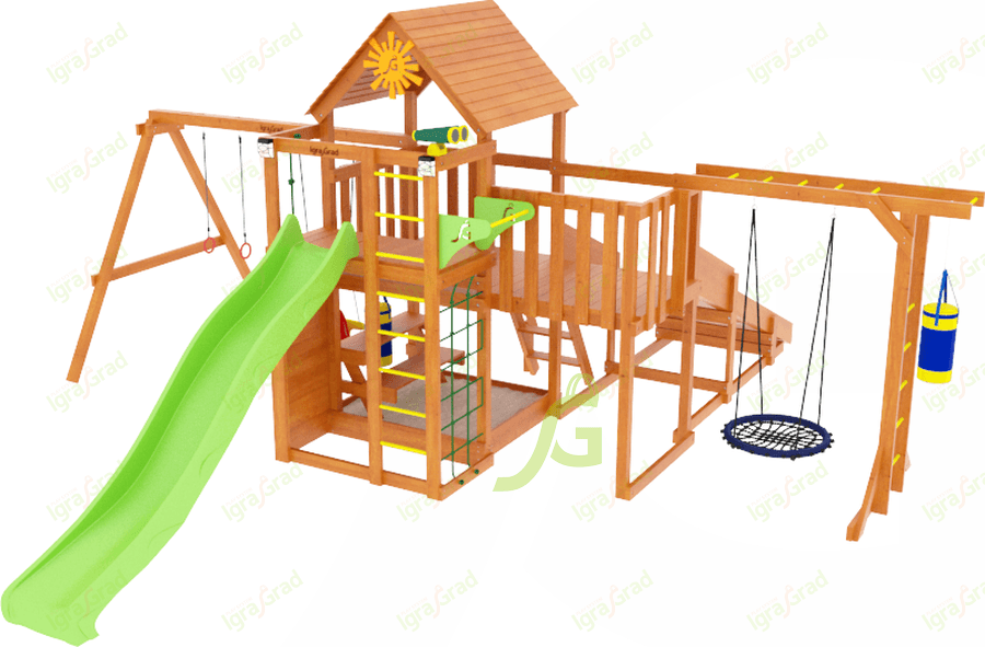 Исследовательский инстинкт и огромное желание залезть выше головы присуще абсолютно всем детям! И не надо их за это ругать! Причём в наше время нужно ещё и хвалить малыша за то, что он исследует всё вокруг, а ни сидит за планшетом. Детская площадка IgraGrad Крафт Pro 4 – это то место, где можно безопасно проводить время: лазать вверх-вниз, качаться, играть с песком, кататься с горки.