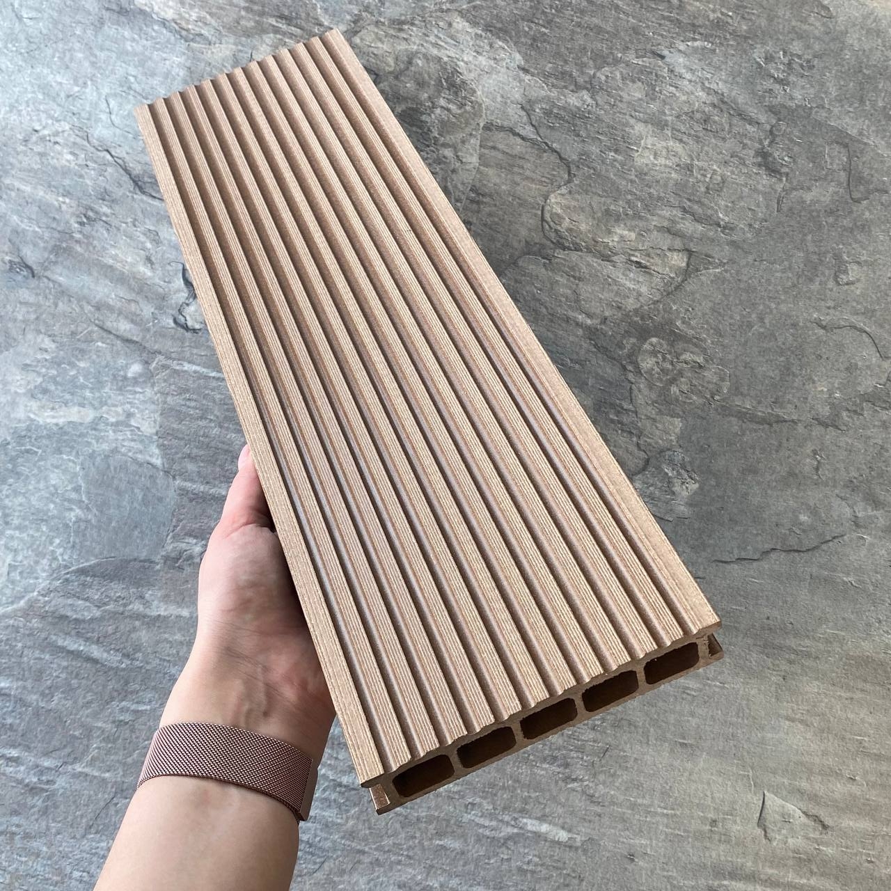 Пустотелая террасная доска Latitudo Euro выпускается двухсторонней. Рабочая сторона – крупный вельвет, не скользит, её легко убирать, бороздки не задерживают грязь и камешки. Обратная декоративная сторона – тиснение под дерево, кроме укладки на террасе хорошо подходит в качестве универсальной отделки (подступенки, торцы террасы, стенки и т.д.)