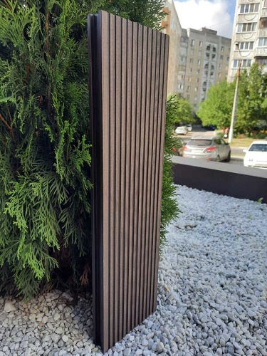 Пустотелая террасная доска Latitudo Euro выпускается двухсторонней. Рабочая сторона – крупный вельвет, не скользит, её легко убирать, бороздки не задерживают грязь и камешки. Обратная декоративная сторона – тиснение под дерево, кроме укладки на террасе хорошо подходит в качестве универсальной отделки (подступенки, торцы террасы, стенки и т.д.)