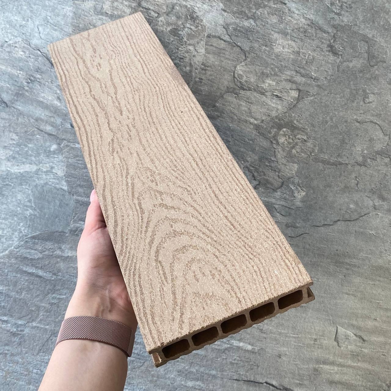 Пустотелая террасная доска Latitudo Euro выпускается двухсторонней. Рабочая сторона – крупный вельвет, не скользит, её легко убирать, бороздки не задерживают грязь и камешки. Обратная декоративная сторона – тиснение под дерево, кроме укладки на террасе хорошо подходит в качестве универсальной отделки (подступенки, торцы террасы, стенки и т.д.)